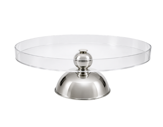 Com design sofisticado e atemporal, a bandeja redonda de acrílico une transparência e brilho em uma composição elegante. Seu topo em acrílico valoriza a exposição dos itens, enquanto a base metálica espelhada com detalhe central esférico traz um toque refinado e contemporâneo.
